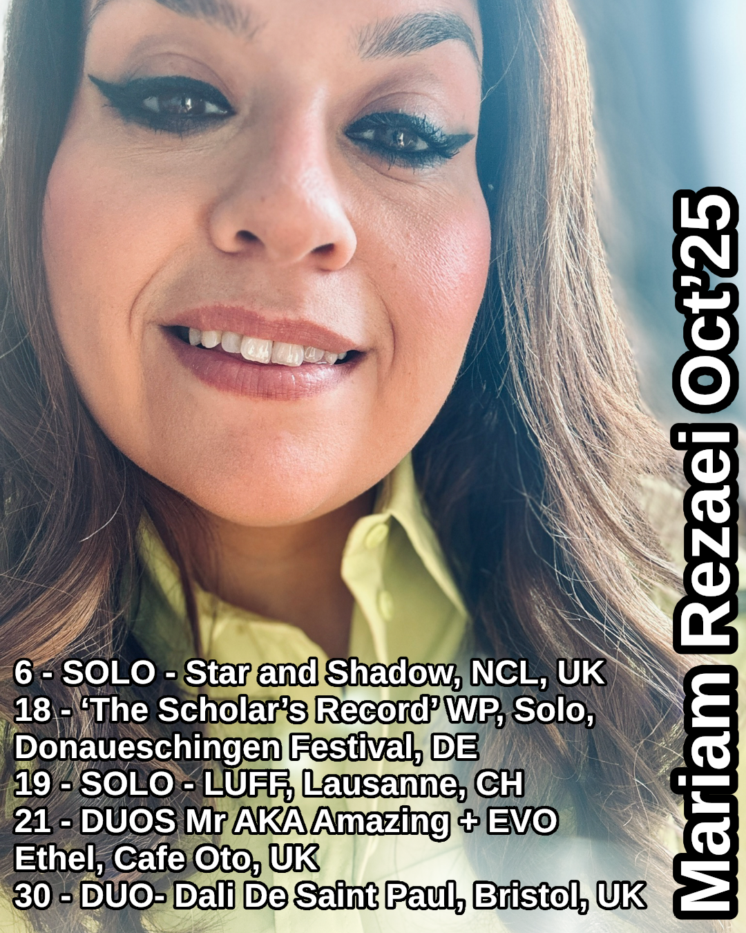 Other collaborations include duos with Pat Thomas, Potente (with Gabriele Mitelli), Jennifer Walshe, Edward George, Farida Amadou, Valentina Magaletti, Robyn’s Rocket, Lasse Marhaug, Evicshen, Raymond MacDonald, Lukas König, Okkyung Lee, Dali de St Paul, Kenosist and Ali Robertson. Rezaei has also performed in a quartet with DJ Sniff, Rex Chen and DJ SlowPitchSound at Taipei Biennial 2023, and been a featured guest of Glasgow Improvisers Orchestra and Pat Thomas and Orphy Robinson’s Black Top.